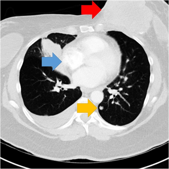 Unmarried-slice of the chest CT showing the abnormalities. Arrows indicate the location of the chest mass (red arrow), lymphadenopathy (bluish arrow), and a lung nodule (yellow arrow). Arrows not present in experimental display